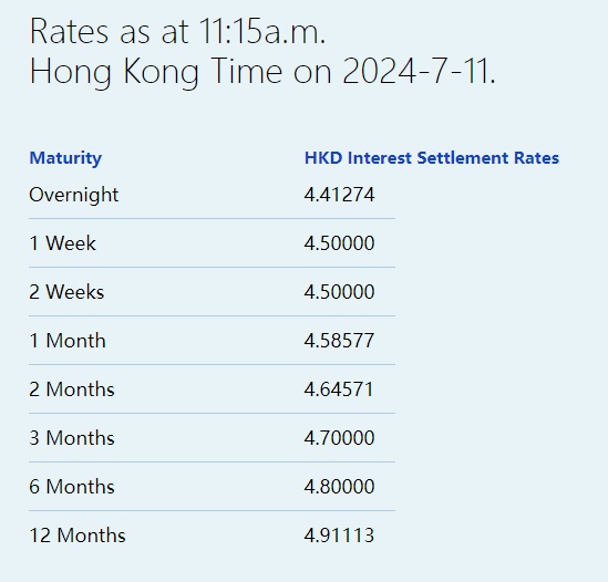 智通财经APP获悉,7月11日,港元拆息持续偏软,其中,隔夜拆息微跌8基点至4.41274%,见逾一周新低;与楼按相关的一个月拆息亦结束三连升,报4.58577%。