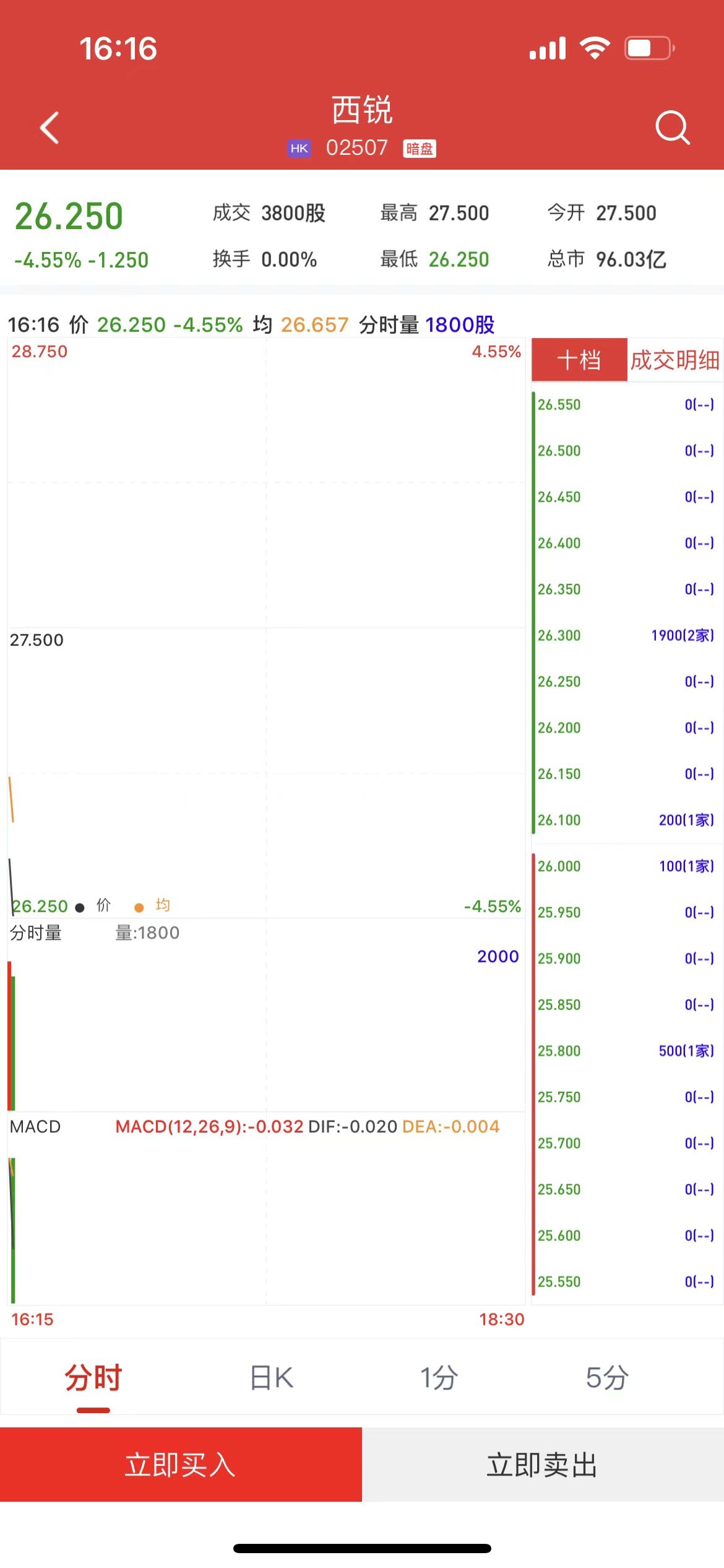 智通财经APP获悉,西锐(02507)将于7月12日(周五)在香港挂牌。截至发稿,利弗莫尔证券暗盘交易显示报价26.25港元,较招股价27.50港元下跌4.55%。每手100股,不计手续费,每手亏125港元。