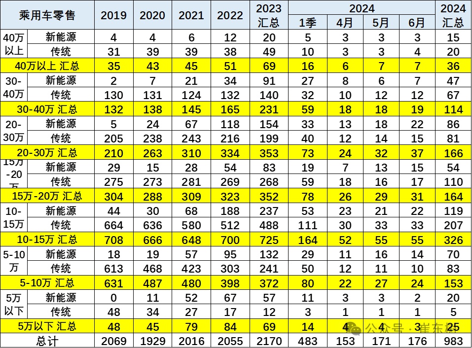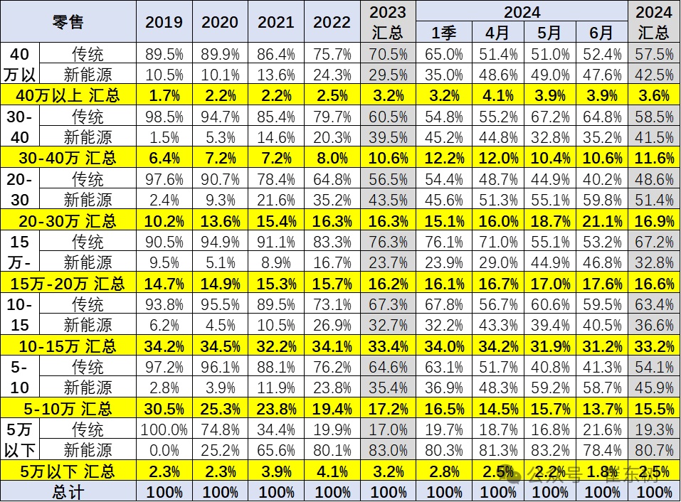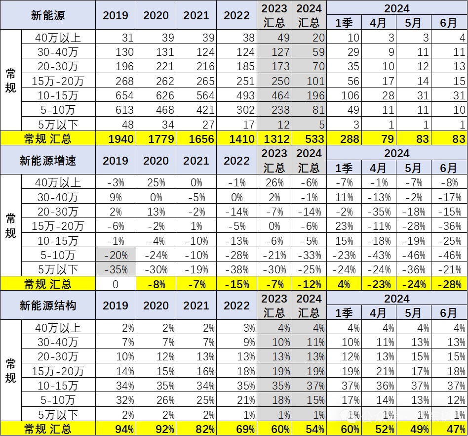 从结构分析看,入门级萎缩,消费基盘不扎实的问题较大,中低端购买力不足,价格战也明显爆发。传统燃油车价格段上行的现象并不是促进消费的有利因素,需要普通消费群体更强的购买入门级车消费,也就是低端消费很重要。因此改善普通群体需求购买力,实现车市价格端相对均衡,拉动入门级消费,实现首购群体的消费入门。