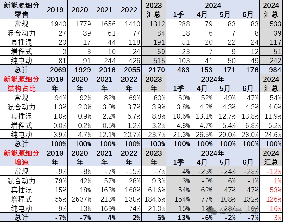 纯电动新能源车国内零售持续高增长,插混的表现近三年表现突出,增程持续小幅增长。传统乘用车的销量出现持续下行压力。