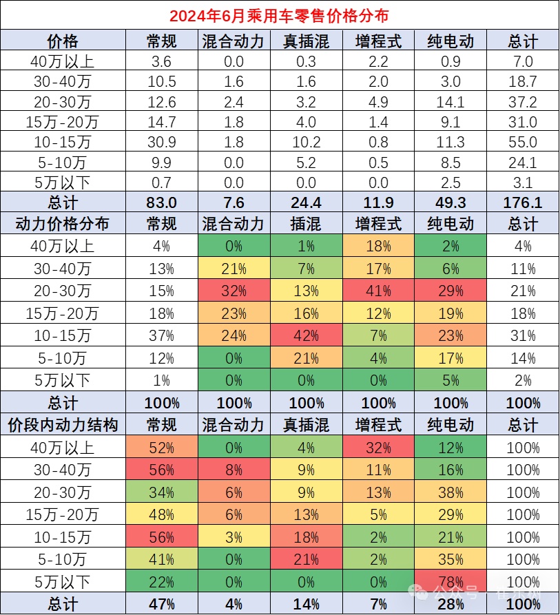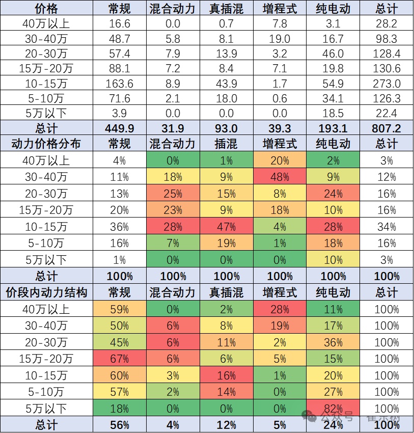 在价格段市场内,动力分布式相对是不均衡的。其中在5万元以下市场的纯电动表现最为强,而增程式电动车是在高端市场表现分布相对是最强,而混合动力是在20-30万元表现相对较强。