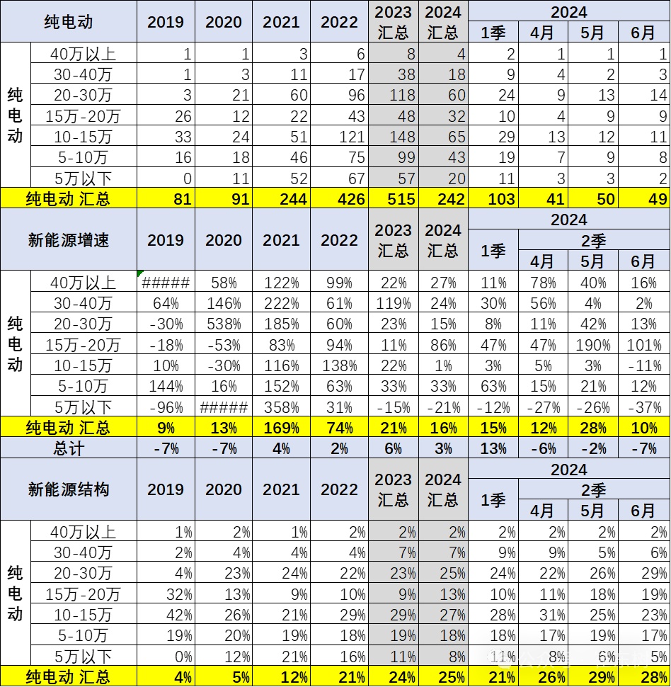 5万元以下车型2021-2022年较2020年的占比持续上升,主要是微型电动车的销量贡献。但2023年以来又持续下降,2024年5万元以下车型的销量占比目前仅有2.5%,较2023年下降0.7个百分点。5-15万的传统车型的销量下滑与新能源车的增长抵消后,总体下降趋势仍明显。