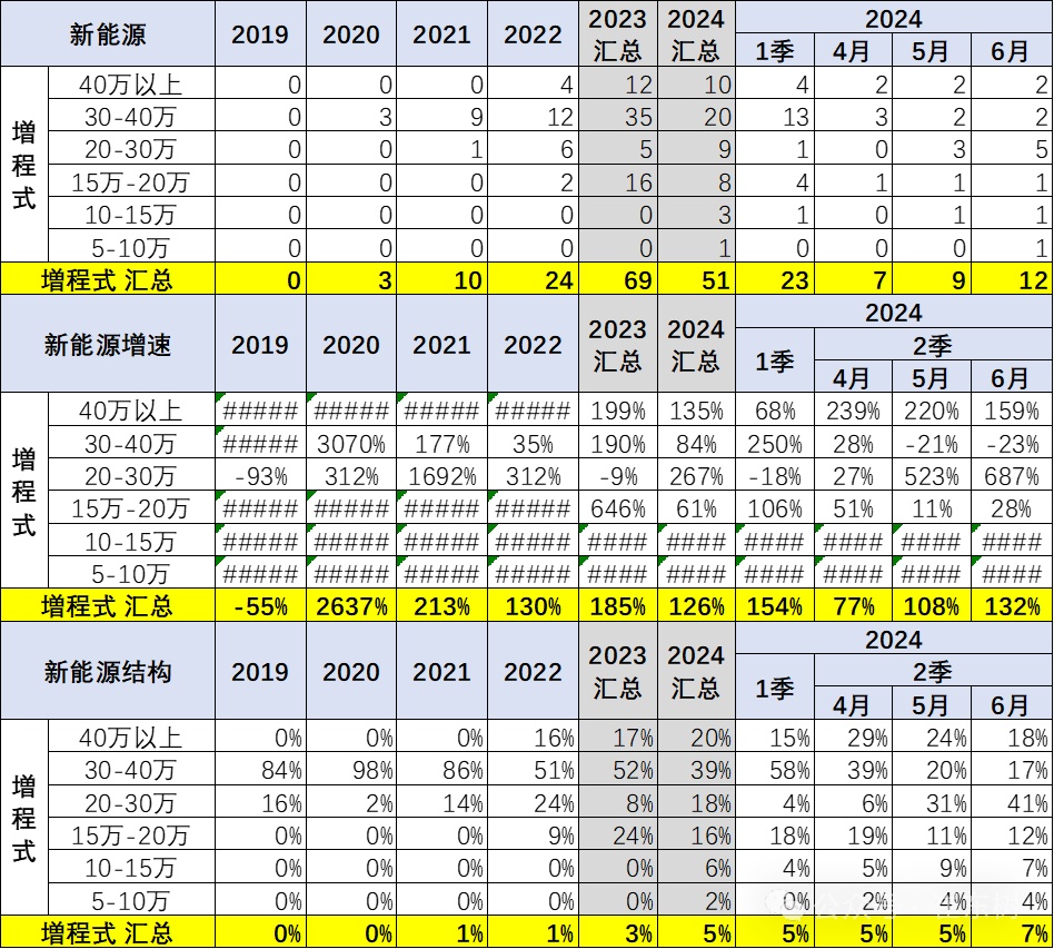 増程式作为纯电动的分支被放到插混中,目前表现持续走强,高端和15万元级别产品均较强。