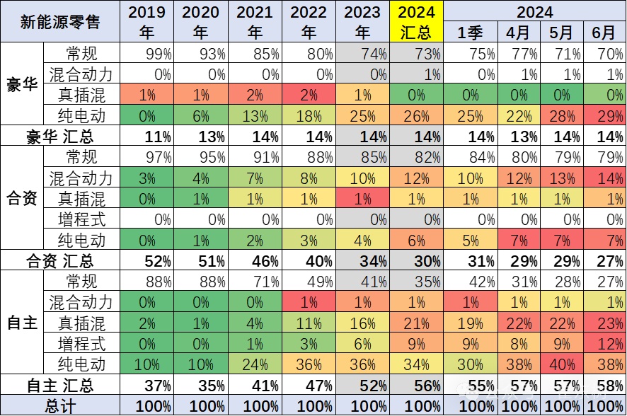 2024年自主品牌表现很好,新能源全面发力,增程与插混表现均很好。总体看新能源的优势区域在自主的创新技术带来的高端油电混动较突出,新势力的结构波动较大,增程表现较好。