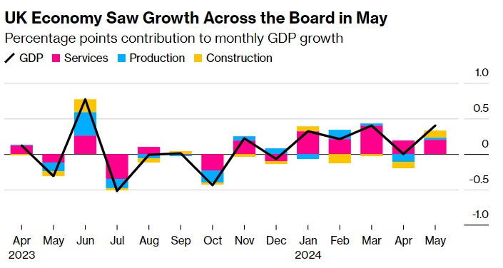 智通财经获悉,英国5月份经济增长速度是预期的两倍。英国国家统计局周四表示,继4月份持平后,5月份国内生产总值(GDP)环比增长0.4%,高于经济学家此前的预期为0.2%,建筑业近一年来最快的扩张速度。尽管如此,英国经济复苏势头并未稳固,因此可能对英国央行降息预期影响。不过,英国经济持续增长再加上政治风险消退,这给英国股市带来利好,也支撑了摩根士丹利等看涨者的观点。