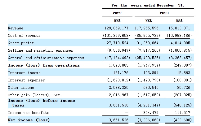 从业绩来看,2022年至2023年(以下简称:报告期内,)星辉印刷的收入分别为1.29亿元(单位:港元,下同)、1.17元,同比下降9.3%;同期的净利润分别为365.2万元,-338.7万元,同比盈转亏。