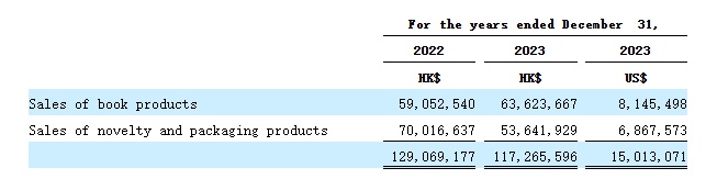 分业务来看,公司可分为图书产品销售和创意及包装产品的销售,两者营收占比几乎为1:1。报告期内,图书产品销售的营收分别为5905.3万元及6362.4万元,同比增长7.7%,占总营收比例分别约为45.8%及54.4%。同期创意及包装类产品的收入分别约为7001.7万元及5364.2万元,同比下滑23.4%,占总营收比例约为54.2%及45.6%。图书产品销售业务较为稳定,但创意及包装产品营收下滑幅度较大,销售额下降主要是由于创意产品的需求减少。