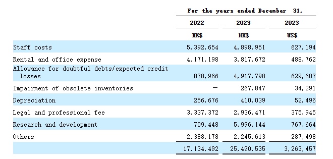 具体来看,公司的一般和行政费用包括员工费用、租金及办公费用、坏账准备金/预期信贷损失、存货减值、折旧、法律及专业费用、研发费用及其他杂项开支。