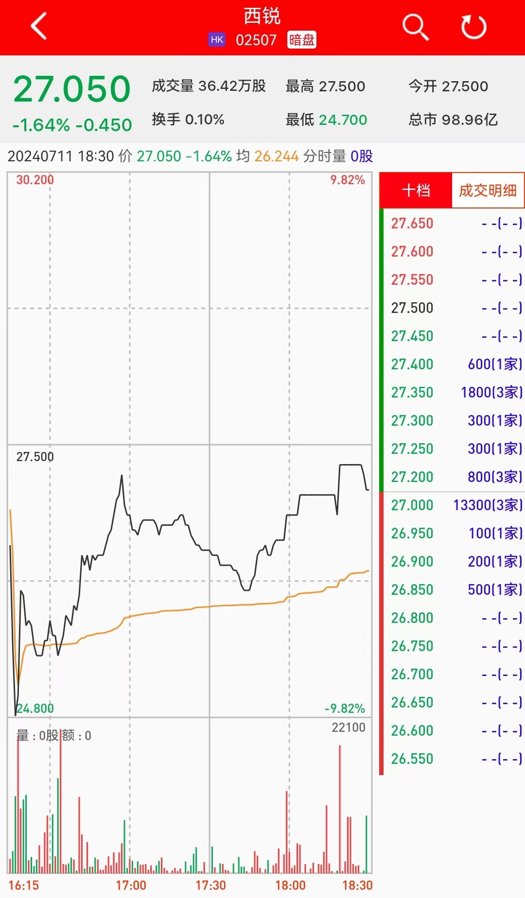 智通财经APP获悉,西锐(02507)将于7月12日(周五)在香港挂牌。截至收盘,利弗莫尔证券暗盘交易显示报价27.05港元,较招股价27.50港元下跌1.64%。每手100股,不计手续费,每手亏45港元。