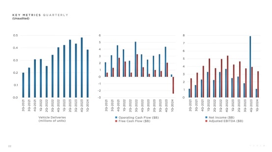 按照业务部门划分,Q1来自于汽车相关业务的总营收为173.78亿美元,与去年同期的199.63亿美元相比下降13%,与上一季度的215.63亿美元相比也有所下降;Q1来自于发电和储能业务的营收为16.35亿美元,同比增长78%;服务及其他业务的营收为22.88亿美元,同比增长25%。