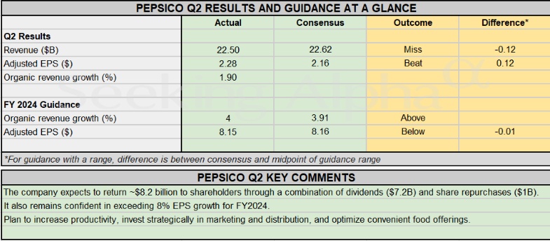 智通财经获悉,百事可乐(PEP.US)公布了第二季度财务业绩。数据显示,Q2营收为225亿美元,同比增长0.8%,较市场预期低1亿美元。非GAAP每股收益为2.28美元,较市场预期高0.12美元。GAAP每股收益为2.23美元,同比增长13%。净利润同比增长12%至30亿美元。