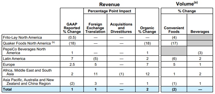 菲多利北美的销量下降了4%,而百事可乐北美饮料部门的销量下降了3%。该指标剔除了反映需求的价格和汇率变化。桂格食品北美本季度的销量下降了17%,该部门仍在处理去年12月和今年1月因潜在沙门氏菌污染而发出的召回事件。