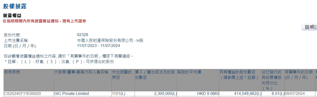 Limited增持中国财险(02328)230股,每股作价9.0865港元,总金额约为2089.90万港元。增持后最新持股数目约为4.15亿股,最新持股比例为6.01%。