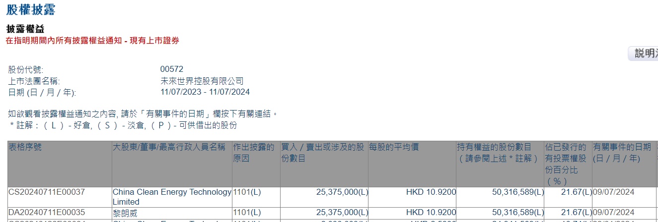 智通财经APP获悉,香港联交所最新资料显示,7月9日,China Clean Energy Technology Limited增持未来世界控股(00572)2537.5万股,每股作价10.92港元,总金额约为2.77亿港元。增持后最新持股数目约为5031.66万股,最新持股比例为21.67%。