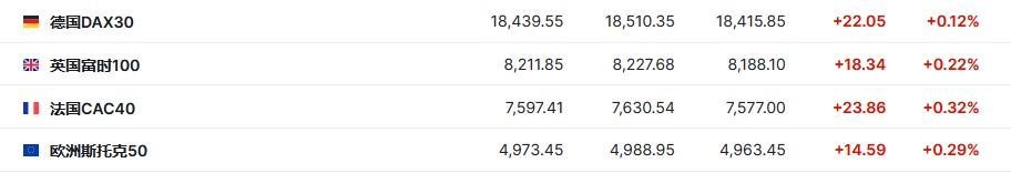 2.截至发稿,德国DAX指数涨0.12%,英国富时100指数涨0.22%,法国CAC40指数涨0.32%,欧洲斯托克50指数涨0.29%。