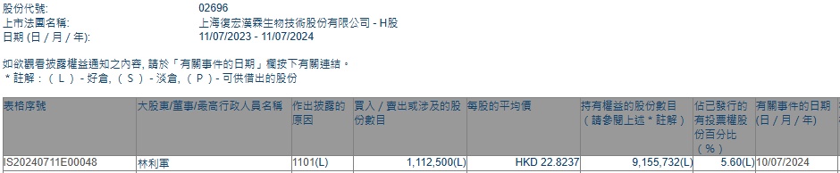 智通财经APP获悉,香港联交所最新资料显示,7月10日,林利军增持复宏汉霖(02696)111.25万股,每股作价22.8237港元,总金额约为2539.14万港元。增持后最新持股数目约为915.57万股,最新持股比例为5.60%。