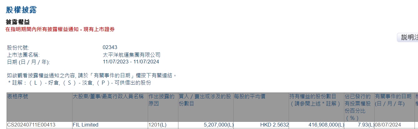 Limited减持太平洋航运(02343)520.7万股,每股作价2.5632港元,总金额约为1334.66万港元。减持后最新持股数目约为4.17亿股,最新持股比例为7.93%。