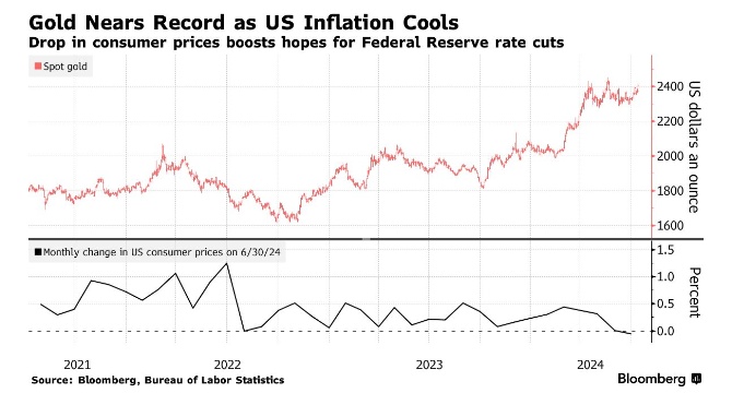 智通财经APP获悉,金价跳涨至每盎司2400美元上方,逼近5月份创下的纪录高点。此前,美国消费者价格指数(CPI)意外下跌,提振了人们对美联储将很快开始降息的希望。