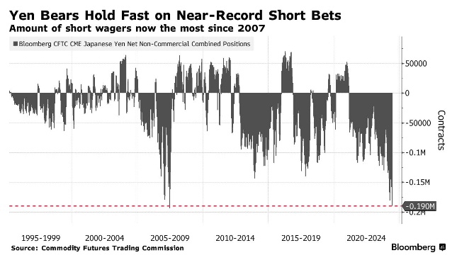 投机交易员已经积累了大量做空日元的头寸。根据美国商品期货交易委员会截至7月2日的一周数据,非商业交易员目前持有约189560份合约(价值约147亿美元)与未来几周看跌日元相关的合约(价值约147亿美元),为2007年以来的最高水平。