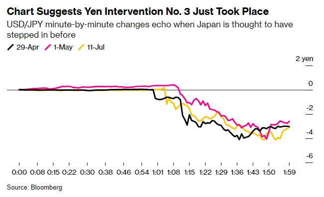周四的飙升与今年之前的干预有相似之处,当时日本财务省在4月29日和5月1日买入了9.8万亿日元,以遏制明显的波动。日元周四创下5月1日以来最大单日涨幅。