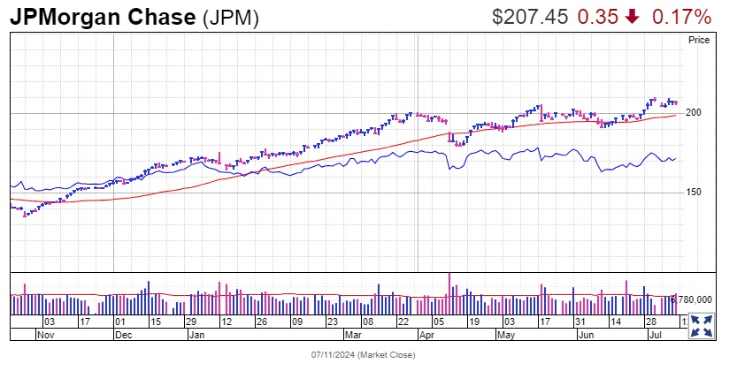 在股价表现方面,摩根大通在经历周四的小幅下跌后,依然保持在10日移动均线上方的关键支撑位。此外,该股票在本周初收复了205.88美元的买入点,并已进入一个为期六周的稳定买入区域。7月3日,摩根大通的股价更是创下了210.38美元的历史新高,而自今年年初以来,其股价已经累计上涨了22%。