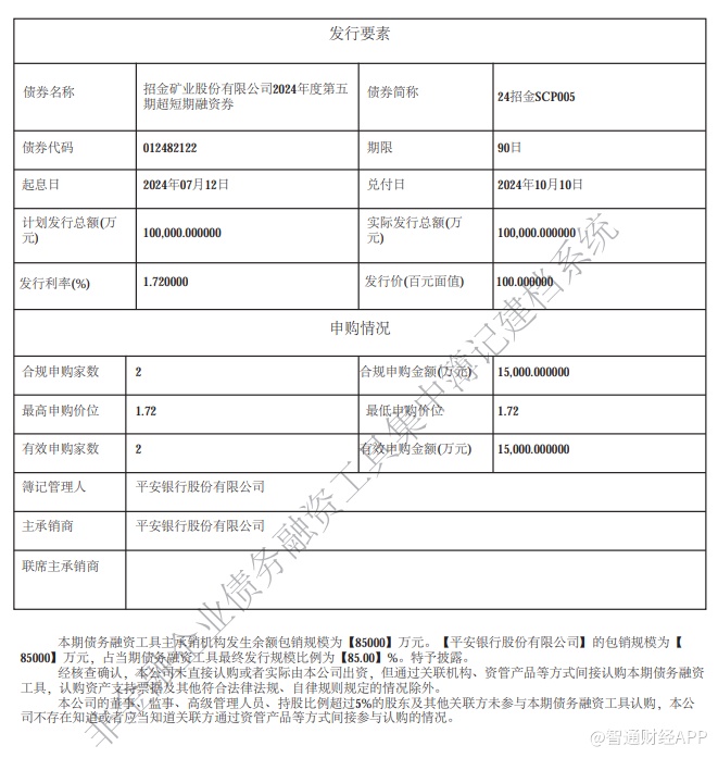 智通财经APP讯,招金矿业(01818)发布公告,公司于2024年07月11日发行了“24招金SCP005”,现将发行申购、配售、分销情况公告如下: