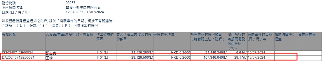 智通财经APP获悉,香港联交所最新资料显示,7月10日,董事局主席王峰增持蓝港互动(08267)2812.95万股,每股作价0.26港元,总金额约为731.37万港元。增持后最新持股数目约为1.07亿股,最新持股比例为29.17%。