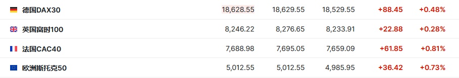 2.截至发稿,德国DAX指数涨0.48%,英国富时100指数涨0.28%,法国CAC40指数涨0.81%,欧洲斯托克50指数涨0.73%。