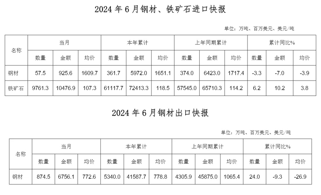 智通财经APP获悉,中国钢铁工业协会发文,根据海关统计快讯数据,2024年6月,我国进口钢材57.5万吨,环比下降6.2万吨,降幅9.7%;均价1609.7美元/吨,环比下跌41.8美元/吨,跌幅2.5%。1-6月累计进口钢材361.7万吨,同比减少12.3万吨,降幅3.3%。6月,我国进口铁矿石9761.3万吨,环比下降442.0万吨,降幅4.3%;均价107.3美元/吨,环比上涨1.6美元/吨,涨幅1.5%。1-6月累计进口铁矿石61117.7万吨,同比增加3572.7万吨,增幅6.2%。