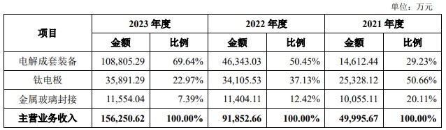 报告期内,泰金新能主营业务收入持续增长,主要由高端绿色电解成套装备、钛电极以及金属玻璃封接制品销售收入构成,具体情况如下:
