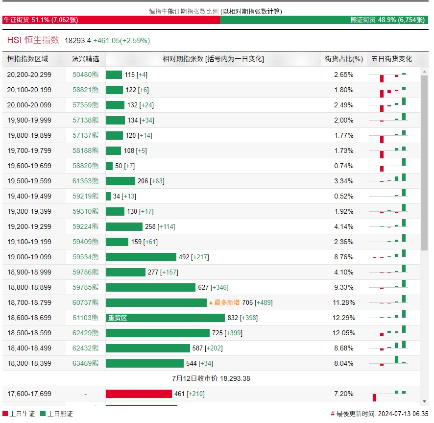 智通财经APP获悉,截至7月13日,恒指最新的牛熊街货比例为51:49。