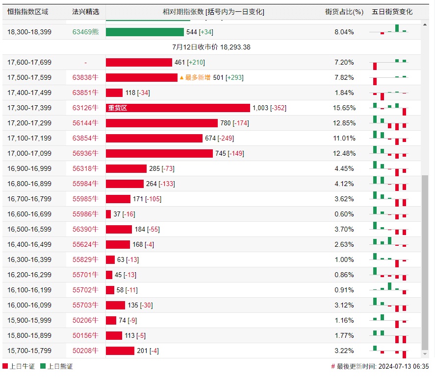 法兴恒指牛熊证街货分布图中的数据显示,熊证街货重货区在18600-18699区间,该区间最新熊证数量为832张,较上一交易日增加398张,最多新增在18700-18799区间,该区间最新牛证数量为706张,较上一交易日增加489张。