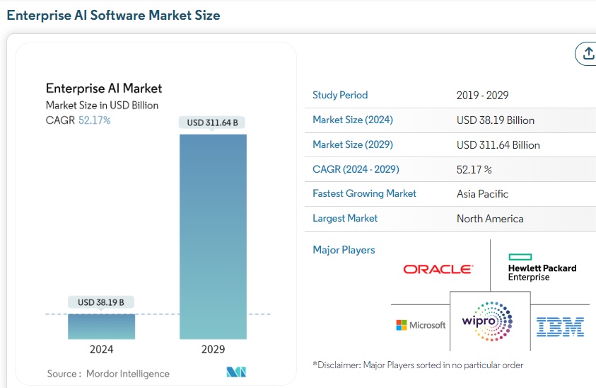 企业级AI可谓处于AI软件开发的“最前沿阵地”,预期数据方面,Mordor Intelligence研究报告显示,预计2024年到2029年,企业人工智能软件市场的总规模将以每年52%的惊人速度快速增长。