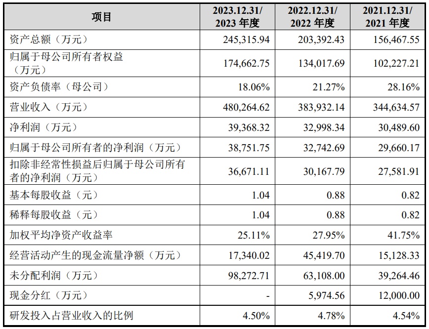 财务方面,于2021年度、2022年度及2023年度,公司实现营业收入分别约为34.46亿元、38.39亿元、48.03亿元。公司净利润分别约为3.05亿元、3.30亿元、3.94亿元人民币。