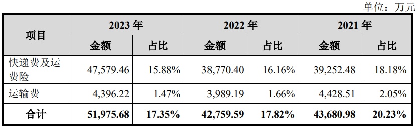 同时,注意物流成本大幅上涨的风险。公司物流成本主要包括运输费、快递费及运费险。其中运输费主要为“头程”运费,即产品运输到京东仓、菜鸟仓、亚马逊海外仓等的相关物流费用。快递费及运费险,主要为国内直邮费用、国际直邮及海外仓到用户端的物流费用(即“尾程”运费)。物流成本金额及占主营业务成本比例如下所示: