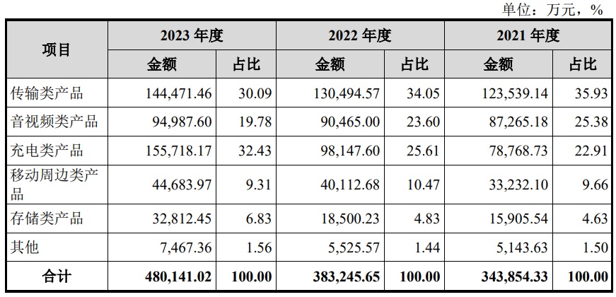 招股书披露,绿联科技是全球科技消费电子知名品牌企业,主要从事3C消费电子产品的研发、设计、生产及销售,致力于为用户提供全方位数码解决方案,产品主要涵盖传输类、音视频类、充电类、移动周边类、存储类五大系列。公司在产品自主研发的基础上,采用以外协成品采购为主,自主生产为辅的生产模式,报告期最近三年自主生产产品金额所占比例约为23%-24%。