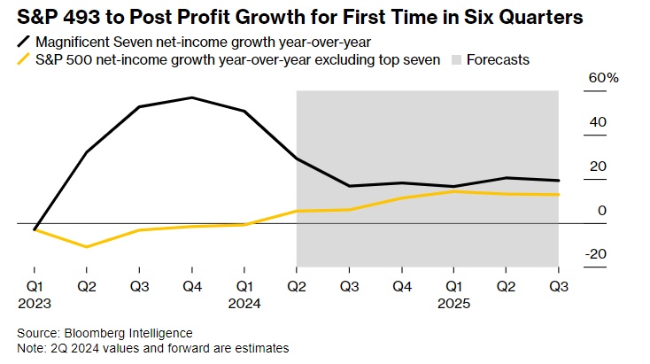自2022年以来,投资者可能会首次将注意力转移到标普500指数中的其他493家公司。预计科技行业以外的公司将报告至少六个季度以来的首次季度盈利增长。根据Bloomberg Intelligence汇编的数据,利润预计将增长5.4%,到今年最后三个月有望加速实现两位数的增长。