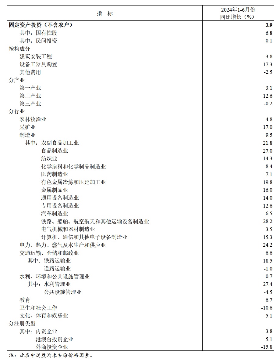 智通财经APP获悉,7月15日,国家统计局数据显示,2024年1—6月份,全国固定资产投资(不含农户)245391亿元,同比增长3.9%(按可比口径计算),其中,民间固定资产投资127278亿元,同比增长0.1%。从环比看,6月份固定资产投资(不含农户)增长0.21%。