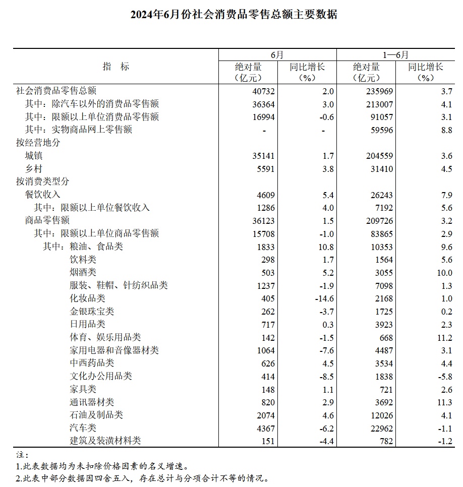 按经营单位所在地分,1—6月份,城镇消费品零售额204559亿元,同比增长3.6%;乡村消费品零售额31410亿元,增长4.5%。其中,6月份城镇消费品零售额35141亿元,增长1.7%;乡村消费品零售额5591亿元,增长3.8%。