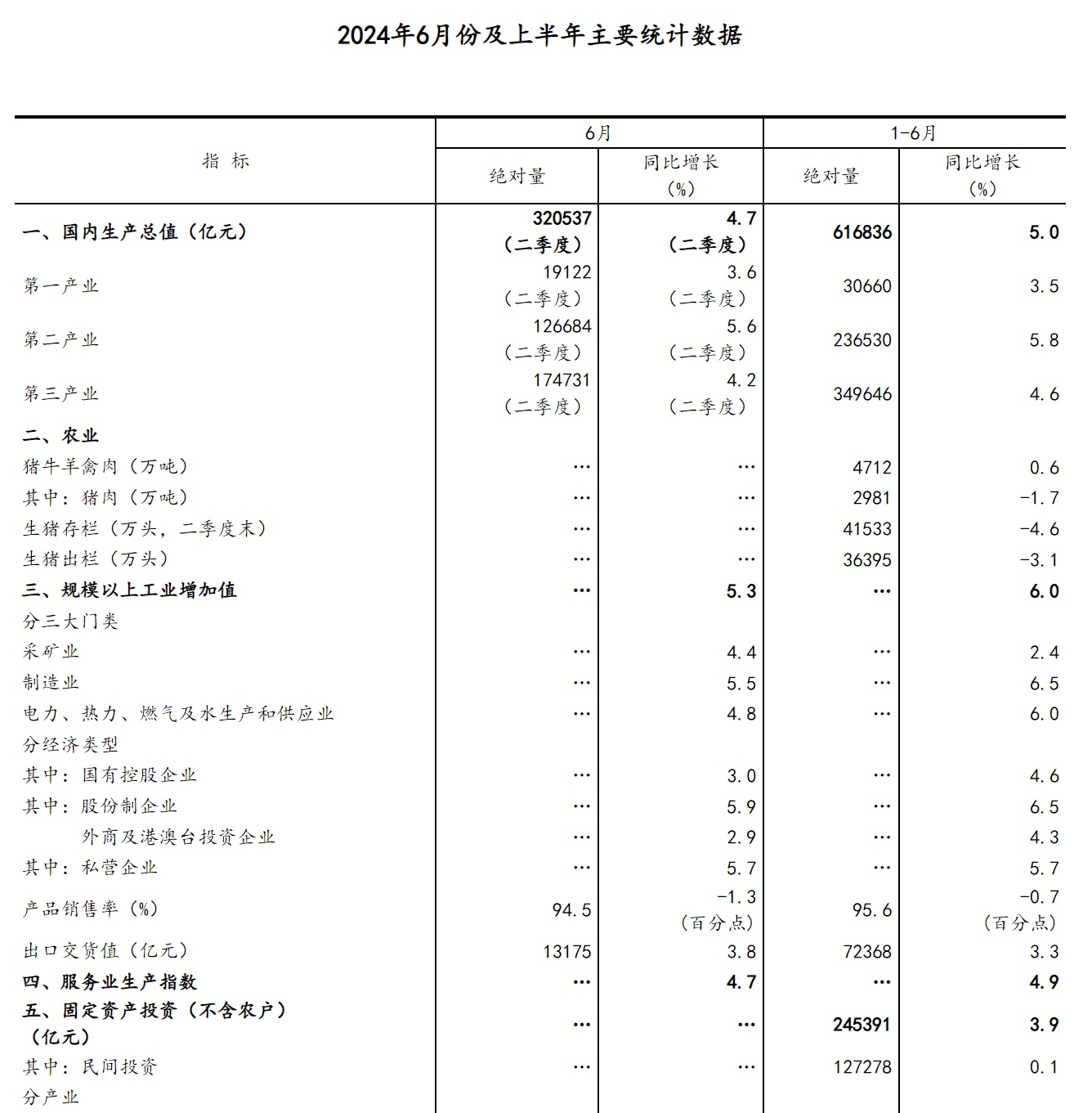 初步核算,上半年国内生产总值616836亿元,按不变价格计算,同比增长5.0%。分产业看,第一产业增加值30660亿元,同比增长3.5%;第二产业增加值236530亿元,增长5.8%;第三产业增加值349646亿元,增长4.6%。分季度看,一季度国内生产总值同比增长5.3%,二季度增长4.7%。从环比看,二季度国内生产总值增长0.7%。