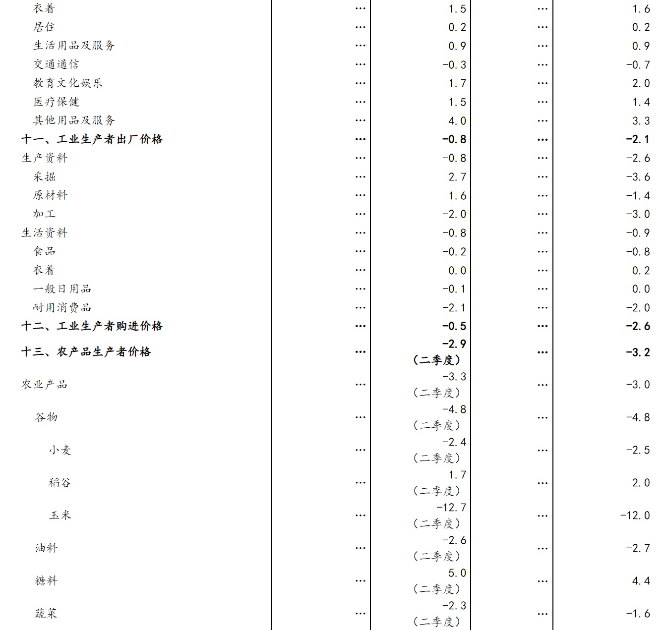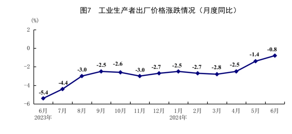 上半年,全国工业生产者出厂价格同比下降2.1%,降幅比一季度收窄0.6个百分点。其中,6月份同比下降0.8%,环比下降0.2%。上半年,工业生产者购进价格同比下降2.6%。其中,6月份同比下降0.5%,环比上涨0.1%。
