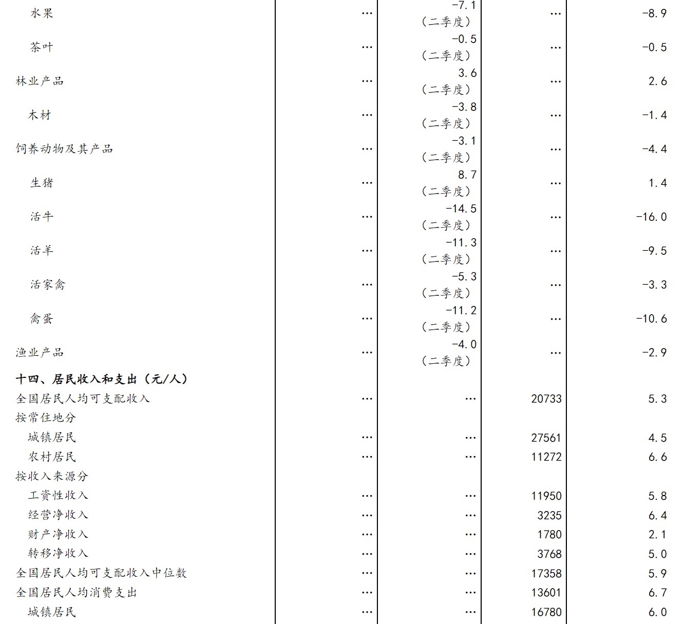 上半年,全国居民人均可支配收入20733元,同比名义增长5.4%,扣除价格因素实际增长5.3%。按常住地分,城镇居民人均可支配收入27561元,同比名义增长4.6%,实际增长4.5%;农村居民人均可支配收入11272元,同比名义增长6.8%,实际增长6.6%。从收入来源看,全国居民人均工资性收入、经营净收入、财产净收入、转移净收入分别名义增长5.8%、6.4%、2.1%、5.0%。全国居民人均可支配收入中位数17358元,同比名义增长5.9%。