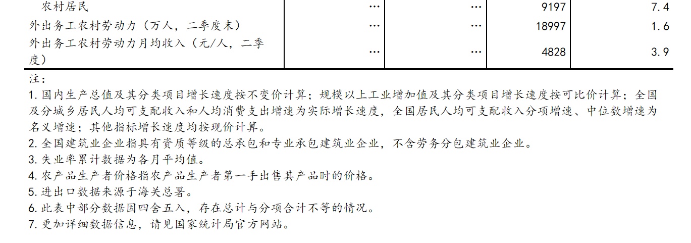 上半年,农业(种植业)增加值同比增长4.0%。夏粮生产再获丰收。全国夏粮总产量14978万吨,比上年增加363万吨,增长2.5%。上半年,猪牛羊禽肉产量4712万吨,同比增长0.6%,其中,牛肉、禽肉产量分别增长3.9%、6.3%,猪肉、羊肉产量分别下降1.7%、0.9%;牛奶产量增长3.4%,禽蛋产量增长2.7%。二季度末,生猪存栏41533万头,同比下降4.6%;上半年,生猪出栏36395万头,下降3.1%。