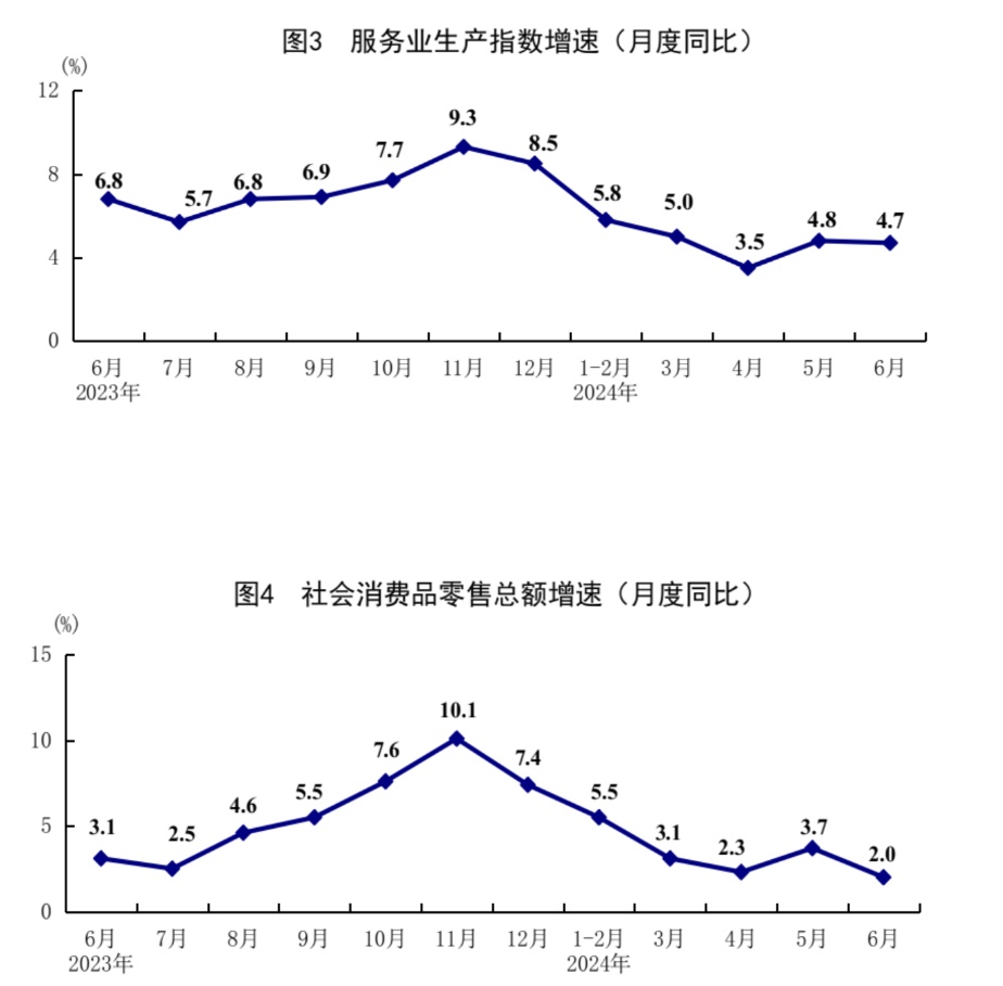 上半年,服务业增加值同比增长4.6%。其中,信息传输、软件和信息技术服务业,租赁和商务服务业,交通运输、仓储和邮政业,住宿和餐饮业,批发和零售业增加值分别增长11.9%、9.8%、6.9%、6.6%、5.7%。6月份,全国服务业生产指数同比增长4.7%。其中,信息传输、软件和信息技术服务业,租赁和商务服务业,交通运输、仓储和邮政业生产指数分别增长13.5%、9.7%、5.4%。1-5月份,规模以上服务业企业营业收入同比增长8.5%。6月份,服务业商务活动指数为50.2%;服务业业务活动预期指数为57.6%,比上月上升0.6个百分点。其中,航空运输、邮政、电信广播电视及卫星传输服务、货币金融服务、保险等行业商务活动指数位于55.0%以上较高景气区间。