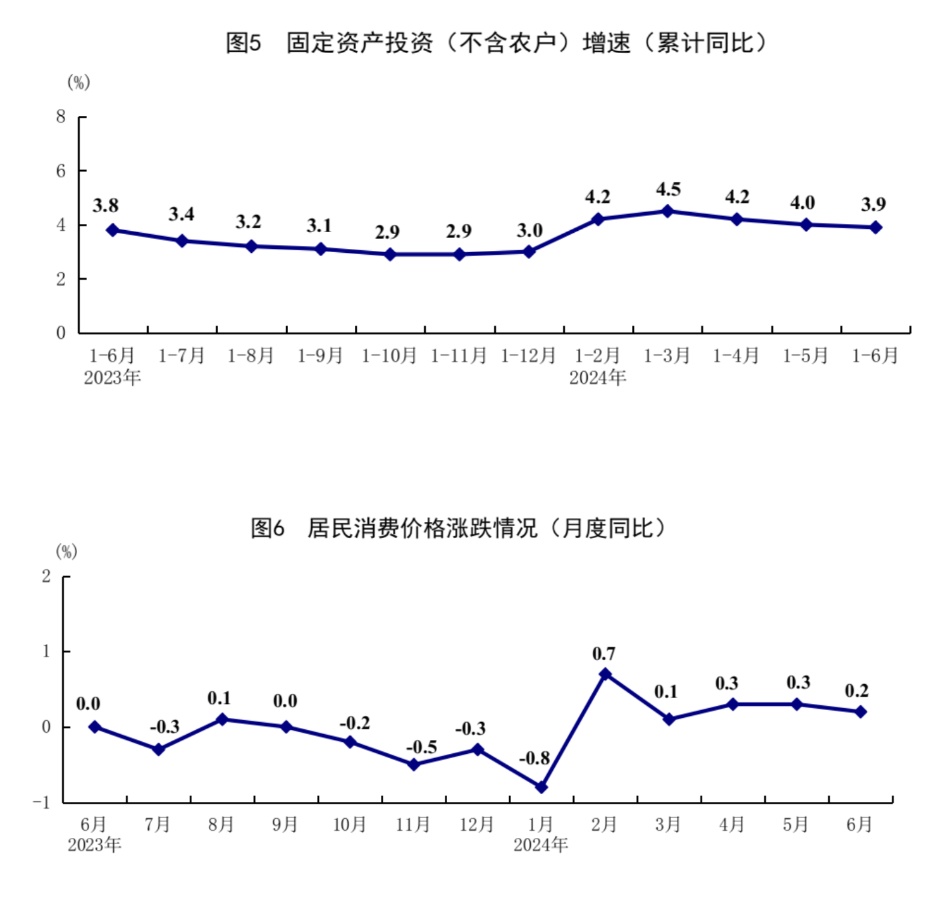 上半年,全国固定资产投资(不含农户)245391亿元,同比增长3.9%;扣除房地产开发投资,全国固定资产投资增长8.5%。分领域看,基础设施投资增长5.4%,制造业投资增长9.5%,房地产开发投资下降10.1%。全国新建商品房销售面积47916万平方米,同比下降19.0%;新建商品房销售额47133亿元,下降25.0%。分产业看,第一产业投资增长3.1%,第二产业投资增长12.6%,第三产业投资下降0.2%。民间投资增长0.1%;扣除房地产开发投资,民间投资增长6.6%。高技术产业投资同比增长10.6%,其中高技术制造业和高技术服务业投资分别增长10.1%、11.7%。高技术制造业中,航空、航天器及设备制造业,计算机及办公设备制造业投资分别增长38.3%、12.1%;高技术服务业中,电子商务服务业、科技成果转化服务业投资分别增长24.1%、17.4%。6月份,固定资产投资(不含农户)环比增长0.21%。