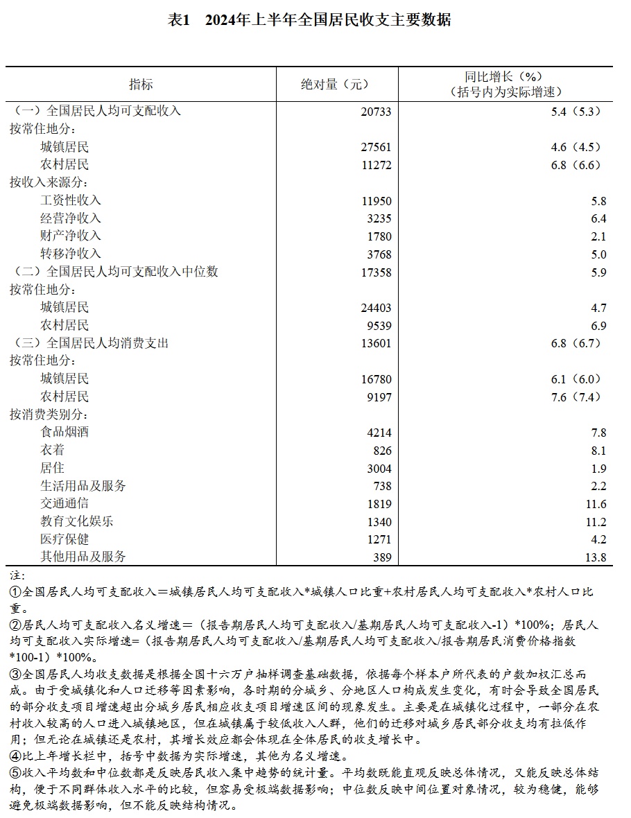 图1 2024年上半年全国及分城乡居民人均可支配收入与增速