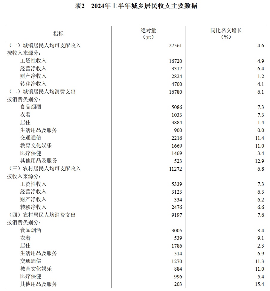 智通财经APP获悉,7月15日,国家统计局数据显示,上半年,全国居民人均可支配收入20733元,比上年同期名义增长5.4%,扣除价格因素,实际增长5.3%。分城乡看,城镇居民人均可支配收入27561元,增长(以下如无特别说明,均为同比名义增长)4.6%,扣除价格因素,实际增长4.5%;农村居民人均可支配收入11272元,增长6.8%,扣除价格因素,实际增长6.6%。
