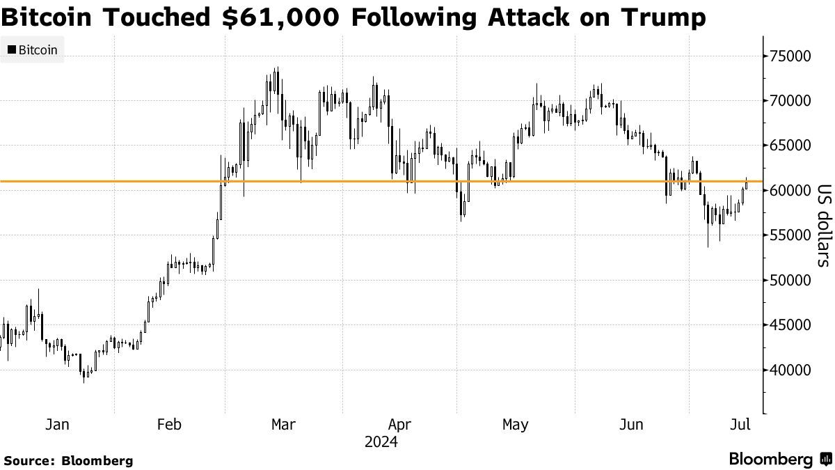 智通财经APP获悉,在特朗普遭遇枪击之后,比特币周一触及6.1万美元,原因是市场猜测这位支持加密货币的共和党总统候选人赢得美国大选的可能性进一步上升。据CoinDesk的数据,截至发稿,比特币涨3%,至61474.77美元,为一周多以来的高点。