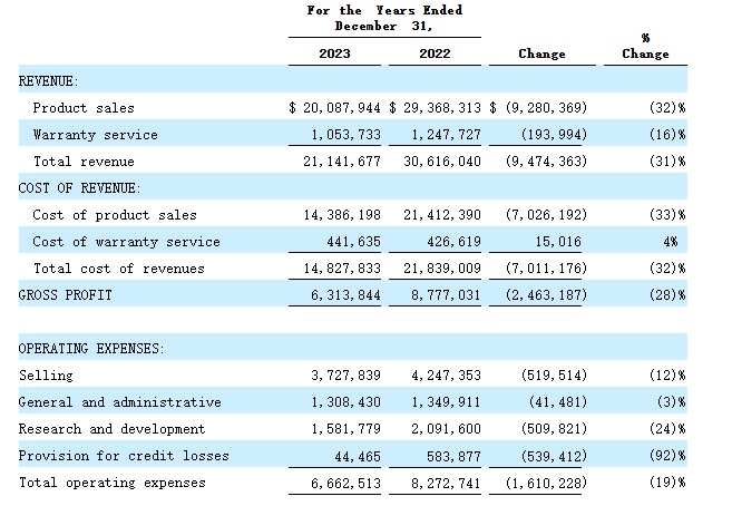 公司主营业务的大幅下滑,来源于设备销售的数量大减。2023年,公司售出129台设备,相较于上一年的265台,减少136台。销售数量砍半,就算平均售价上涨,也无不填补收入损失。