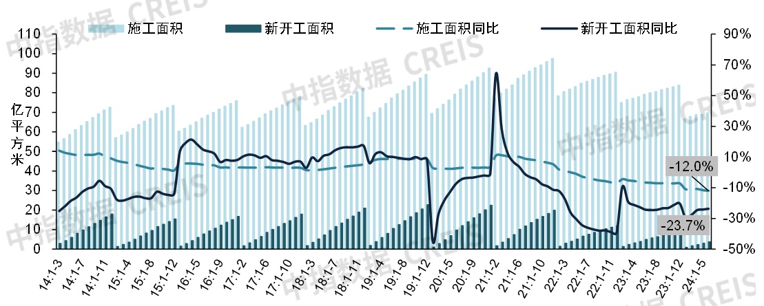 图:2014年至今全国房屋累计新开工和施工面积及其同比增速